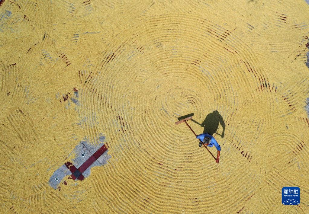 9月29日,貴州省福泉市牛場(chǎng)鎮村民在晾曬稻谷(無(wú)人機照片)。