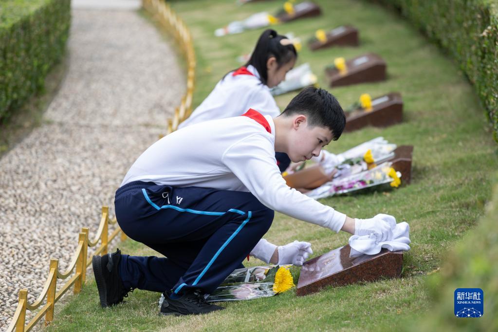 9月30日,在上海龍華烈士陵園烈士墓區,少先隊員在擦拭革命烈士的墓碑。
