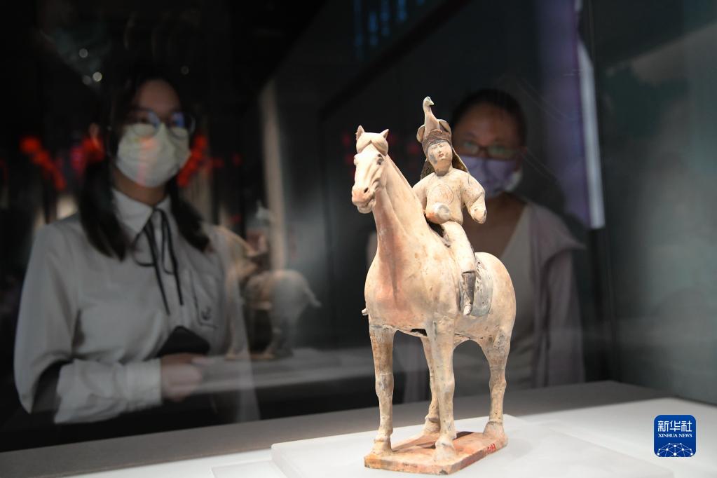 9月30日,觀(guān)眾在西安博物院觀(guān)看大唐金鄉縣主展上展出的騎馬擊腰鼓女俑。