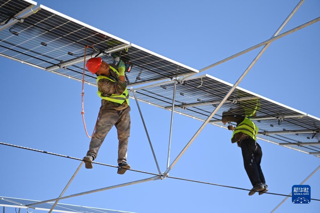 9月29日,在位于甘肅省武威市涼州區的甘肅武威50萬(wàn)千瓦立體光伏治沙產(chǎn)業(yè)化示范項目建設現場(chǎng),施工人員在安裝光伏板。