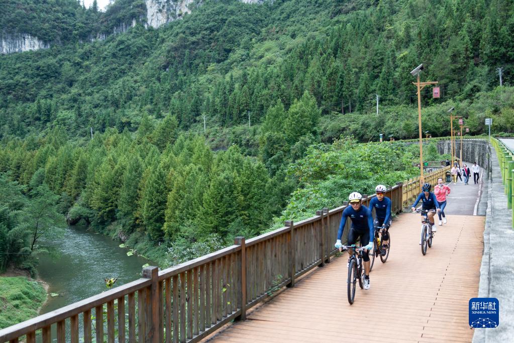 2022年9月25日,人們在湖北省利川市境內的長(cháng)江支流清江邊騎行。