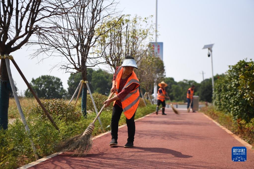 2022年9月27日,湖南省沅江市蓮花島村的退捕漁民在打掃人行道。