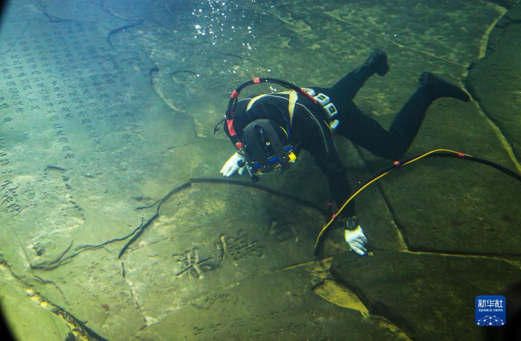 在重慶白鶴梁水下博物館的白鶴梁題刻無(wú)壓容器罩內,潛水員在進(jìn)行清理作業(yè)(2021年3月15日攝)。