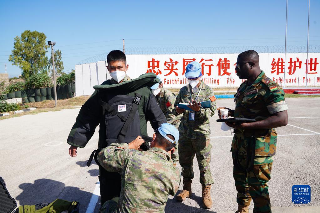 9月26日,在位于黎巴嫩南部辛尼亞村的中國維和部隊營(yíng)區,掃雷官兵向聯(lián)合國駐黎巴嫩臨時(shí)部隊司令部派出的核查組官員展示排爆服穿戴過(guò)程。