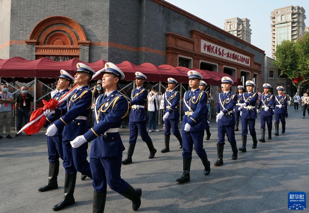 10月1日,在上海中共一大會(huì )址舉行的升旗儀式上,“一大廣場(chǎng)國旗護衛隊”護衛國旗入場(chǎng)。