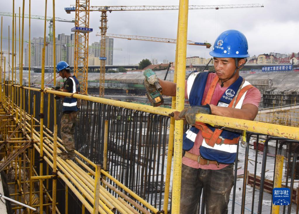 10月1日,在青島國際郵輪母港區啟動(dòng)區地下空間項目工地,中鐵四局的架工班工人姜虎(右)與工友在工地上勞動(dòng)。