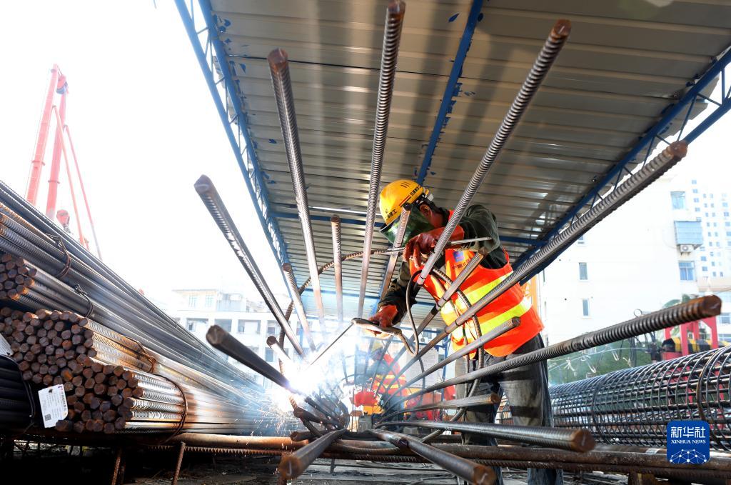 10月1日,在位于上海市靜安區的中建二局靜安談家橋城市更新項目工地,電焊工在進(jìn)行地基工程樁焊接作業(yè)。