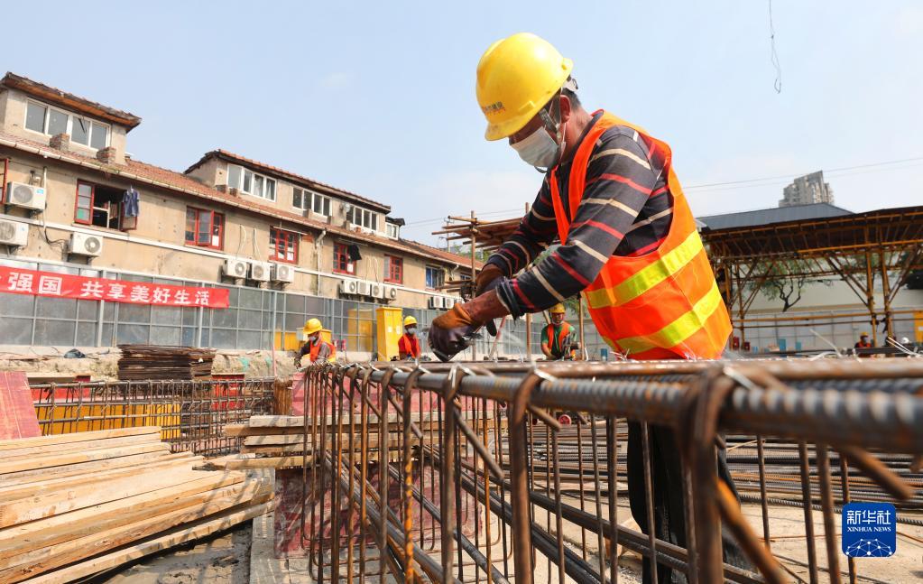 10月1日,在位于上海市靜安區的中建二局靜安談家橋城市更新項目工地,工人在進(jìn)行地基工程樁鋼筋綁扎作業(yè)。