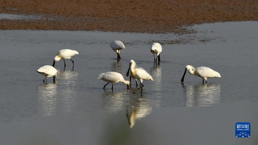 這是4月10日在河南黃河濕地國家級自然保護區孟津段拍攝的白琵鷺。