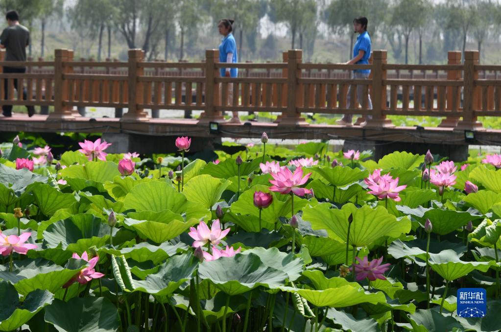 6月21日,在山東省曹縣黃河故道國家濕地公園,游客觀(guān)賞荷花。