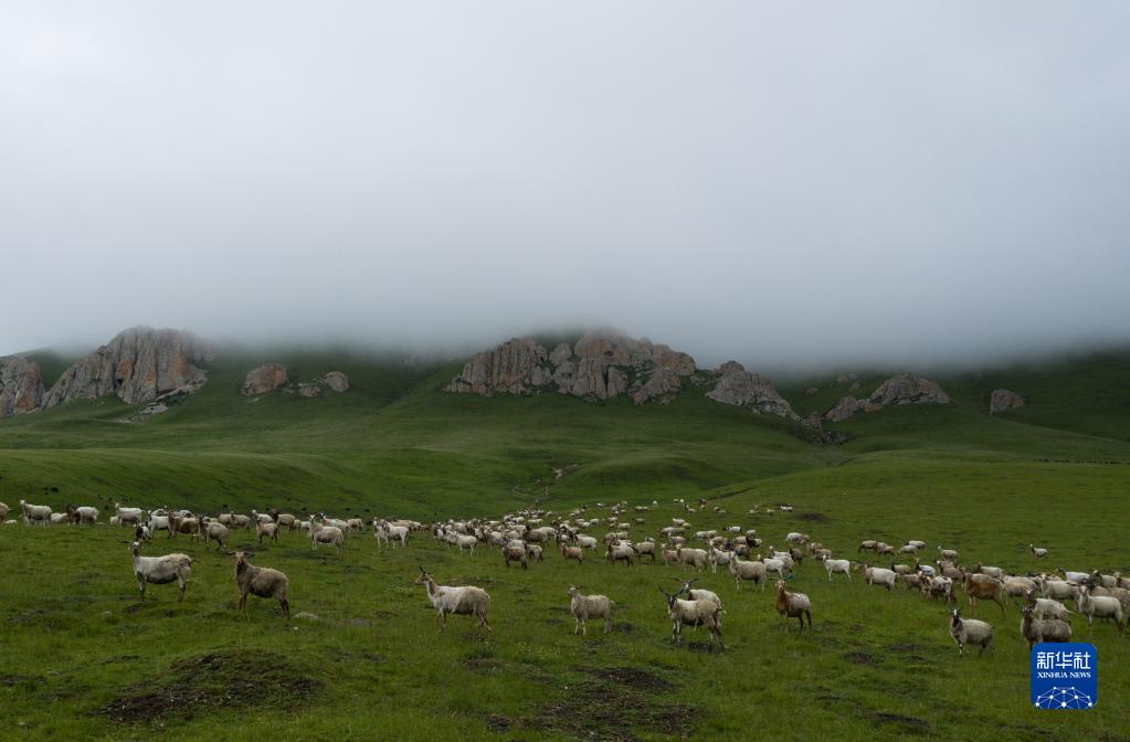 在四川省若爾蓋縣麥溪鄉黑河牧場(chǎng)上,牛羊成群(2022年7月25日攝,無(wú)人機照片)。