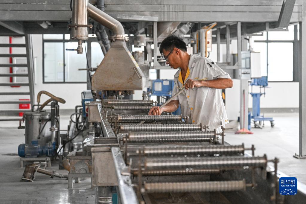 工作人員在位于海南洋浦保稅港區的海南金發(fā)科技有限公司車(chē)間清理設備(9月28日攝)。