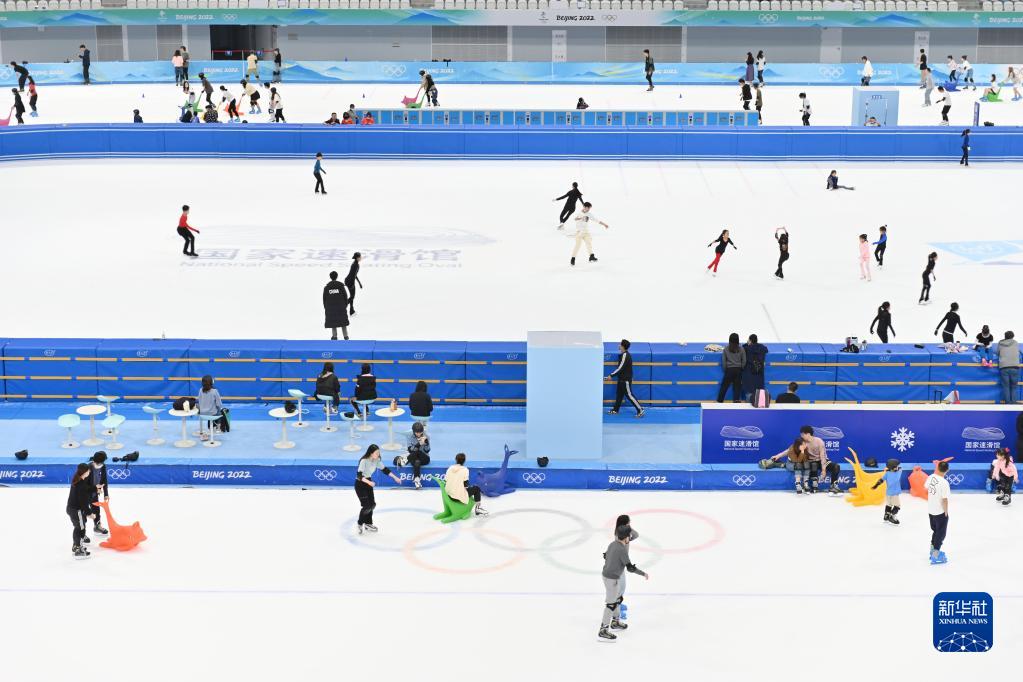 10月1日,人們在“冰絲帶”內體驗冰雪運動(dòng)。