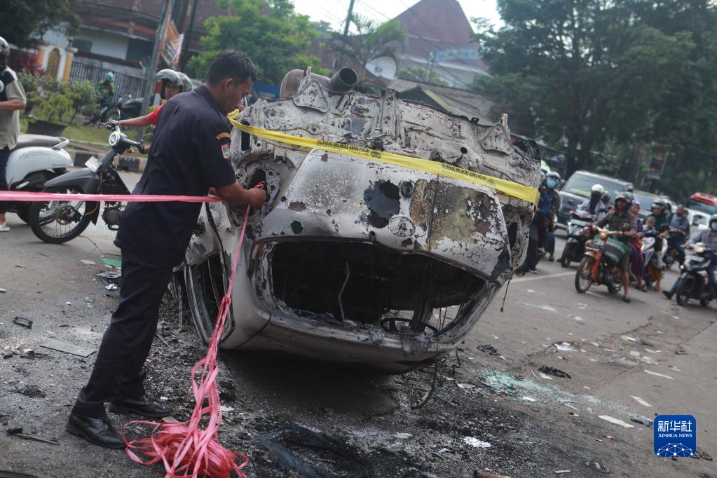 10月2日,在印度尼西亞?wèn)|爪哇省瑪瑯市,警方人員在事發(fā)球場(chǎng)外為被焚毀的車(chē)輛系上繩子。