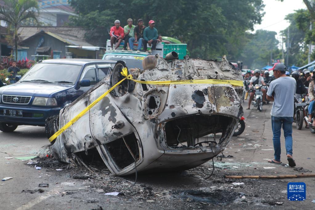 這是10月2日在印度尼西亞?wèn)|爪哇省瑪瑯市事發(fā)球場(chǎng)外拍攝的被焚毀的車(chē)輛。新華社發(fā)(巴尤·諾凡塔攝)
