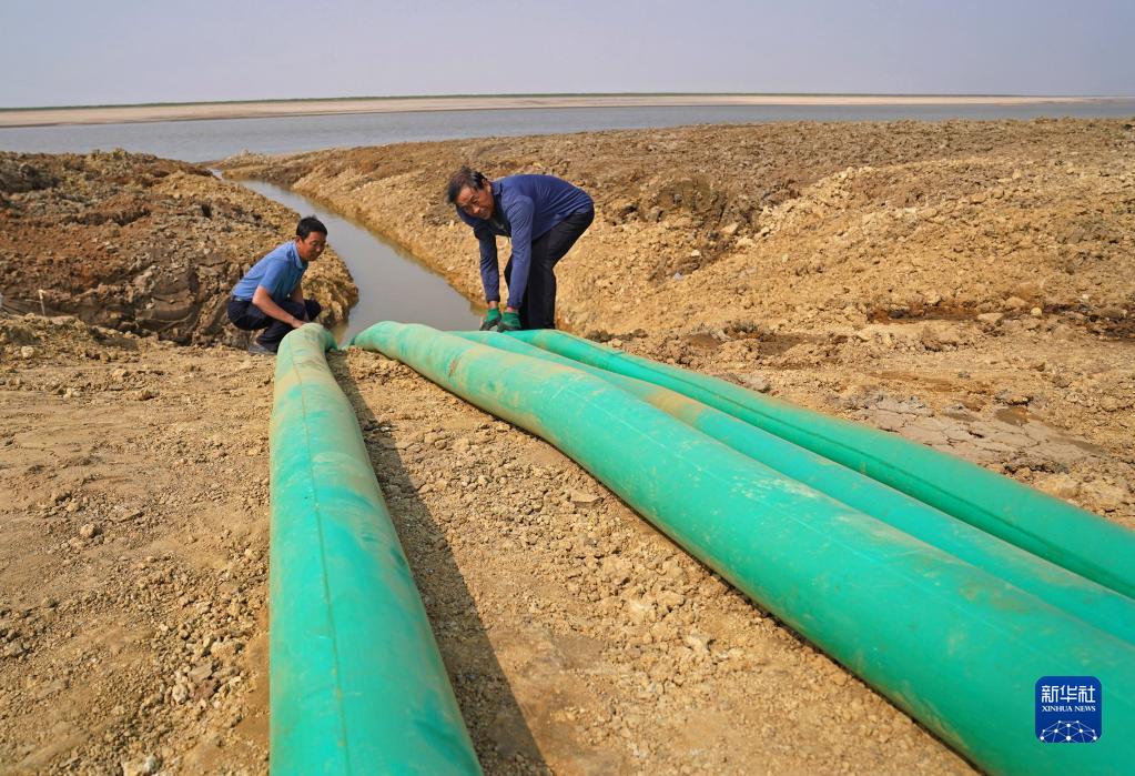 在江西省都昌縣,都昌縣候鳥(niǎo)自然保護區的工作人員用水泵將鄱陽(yáng)湖主航道的水抽至人工水渠,然后輸入至碟形湖中(9月28日攝)。