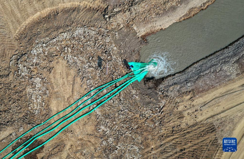 在江西省都昌縣,都昌縣候鳥(niǎo)自然保護區的工作人員用水泵將鄱陽(yáng)湖主航道的水抽至人工水渠,然后輸入至碟形湖中(9月28日攝,無(wú)人機照片)。