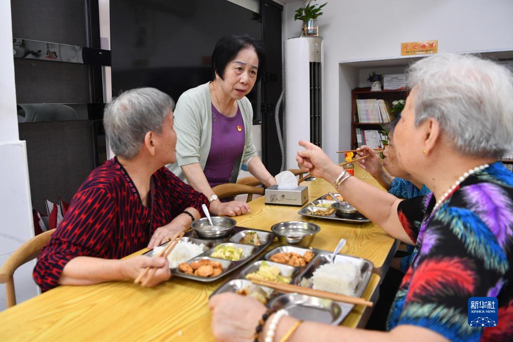 在福建省福州市軍門(mén)社區長(cháng)者食堂內,林丹(左二)與用餐的老人交流(2022年9月9日攝)。