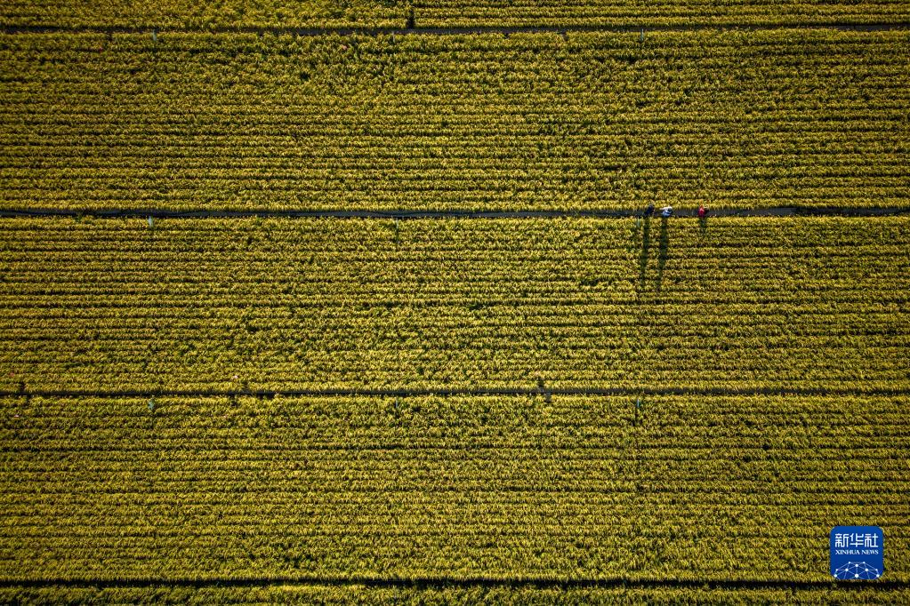 游客在黑龍江省富錦市萬(wàn)畝水稻科技示范園里游覽(2022年9月2日攝,無(wú)人機照片)。