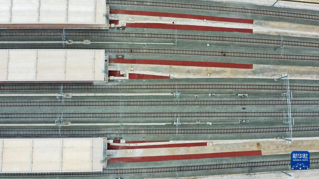 這是完成接觸網(wǎng)送電的銀蘭高鐵甘肅段秦王川站(10月2日攝,無(wú)人機照片)。