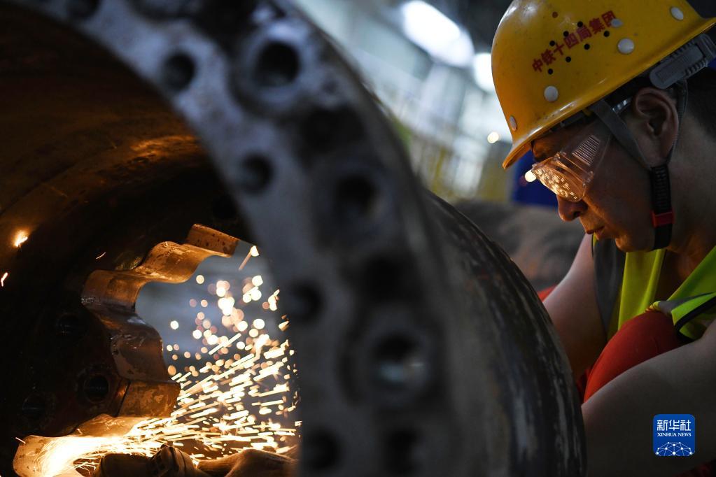 10月3日,工作人員在蕪湖城南過(guò)江隧道施工現場(chǎng)打磨刀桶。
