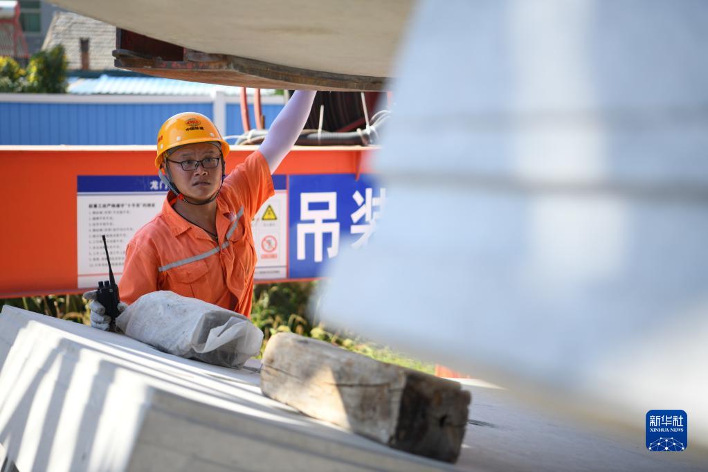 10月3日,在蕪湖城南過(guò)江隧道施工現場(chǎng),工作人員利用設備碼放用于隧道建設的管片。