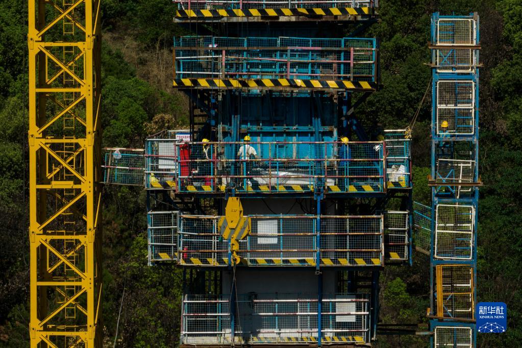10月3日,中交一公局的工人在重慶市北碚區渝武高速公路復線(xiàn)觀(guān)音峽嘉陵江特大橋項目現場(chǎng)施工作業(yè)(無(wú)人機照片)。