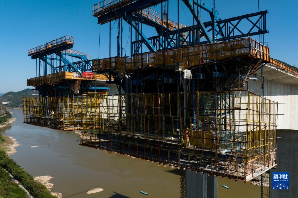 10月3日,中交一公局的工人在重慶市北碚區渝武高速公路復線(xiàn)觀(guān)音峽嘉陵江特大橋項目現場(chǎng)施工作業(yè)(無(wú)人機照片)。