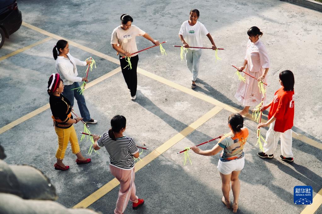 在湖南省桑植縣芙蓉橋白族鄉合群村,張丕和(左一)帶領(lǐng)村民學(xué)習白族舞蹈(9月8日攝)。