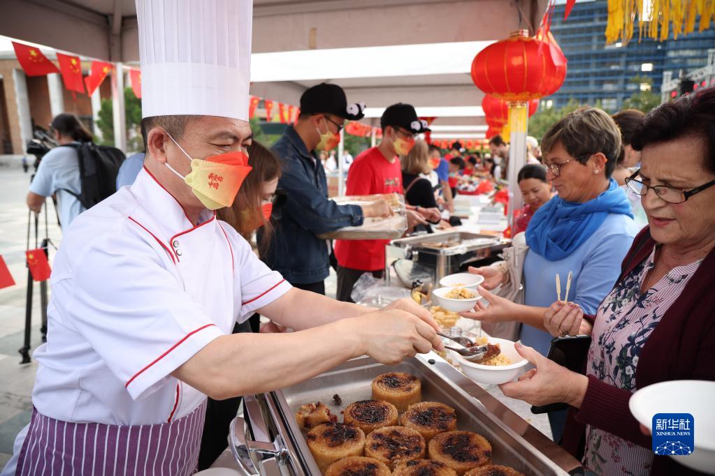 9月30日,在阿爾巴尼亞地拉那,民眾在中國美食節上品嘗美食。