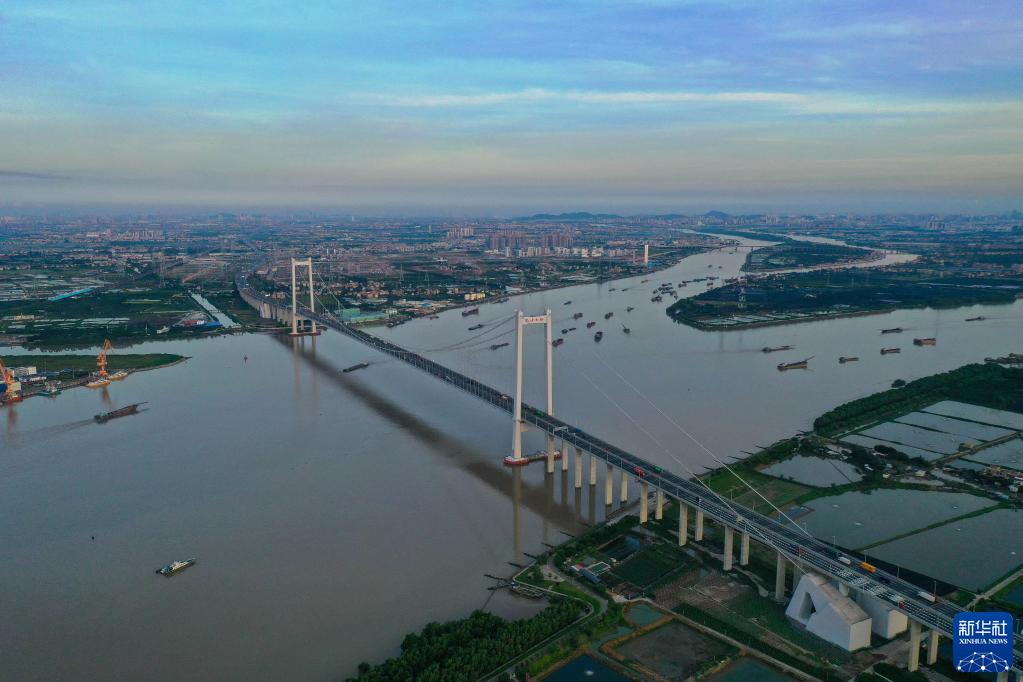 南沙大橋全景(2022年6月29日攝,無(wú)人機照片)。南沙大橋上跨珠江口獅子洋水域,連接廣州市南沙區東涌鎮、番禺區海鷗島和東莞市沙田鎮。