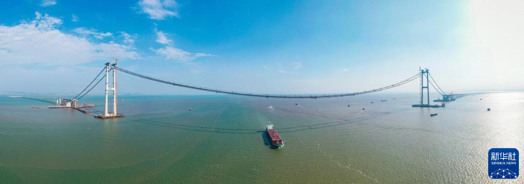 正在建設的珠江入??谏钪型ǖ懒尕暄蟠髽蛑骼|完成架設(2022年9月23日攝,無(wú)人機照片)。