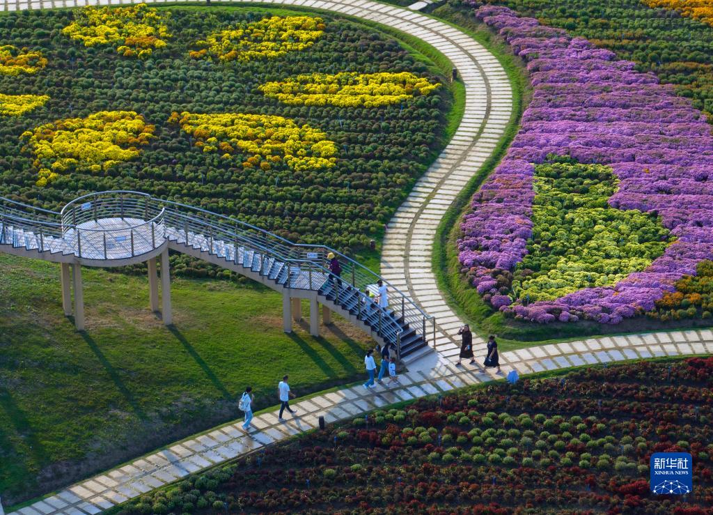 10月3日,游客在江蘇省淮安市白馬湖旅游度假區中的菊花展上賞花(無(wú)人機照片)。