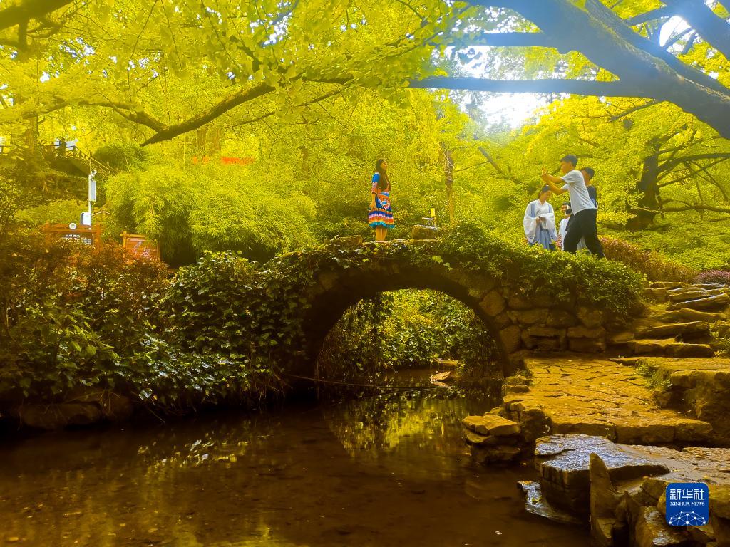 10月1日,游客在貴州省盤(pán)州市妥樂(lè )村小橋流水景點(diǎn)拍照。