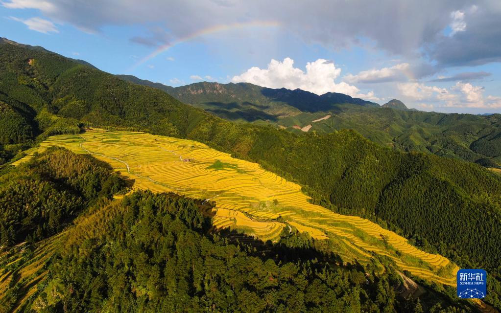 在廣東省清遠市連山壯族瑤族自治縣太保鎮歐家村,彩虹與金黃色的歐家梯田相映成趣(10月3日攝,無(wú)人機照片)。