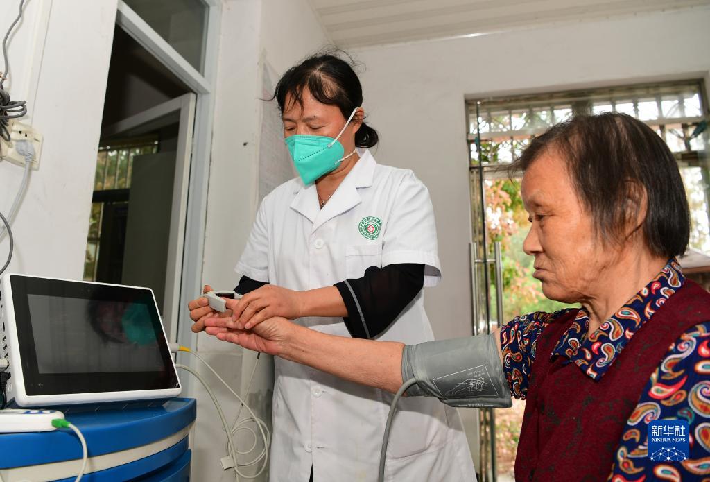 10月4日,在肥西縣豐樂(lè )鎮新倉養老服務(wù)中心,醫護人員使用健康一體機為老人體檢。