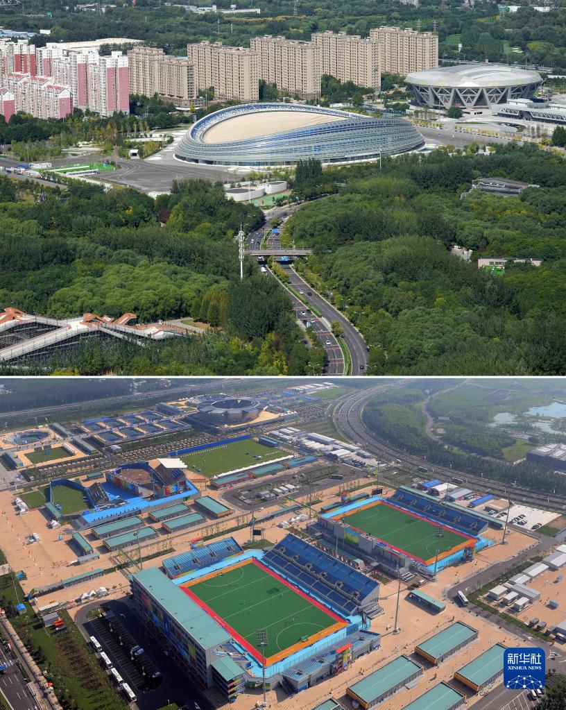 這是一張拼版照片:上圖為2022年9月19日拍攝的2022年北京冬奧會(huì )速度滑冰比賽場(chǎng)館國家速滑館。國家速滑館是利用2008年北京奧運會(huì )曲棍球和射箭項目的臨時(shí)場(chǎng)地建設而成(新華社記者鞠煥宗攝);下圖為2008年8月2日航拍的奧林匹克公園曲棍球場(chǎng)(資料照片,新華社記者陳凱攝)。 新華社發(fā)