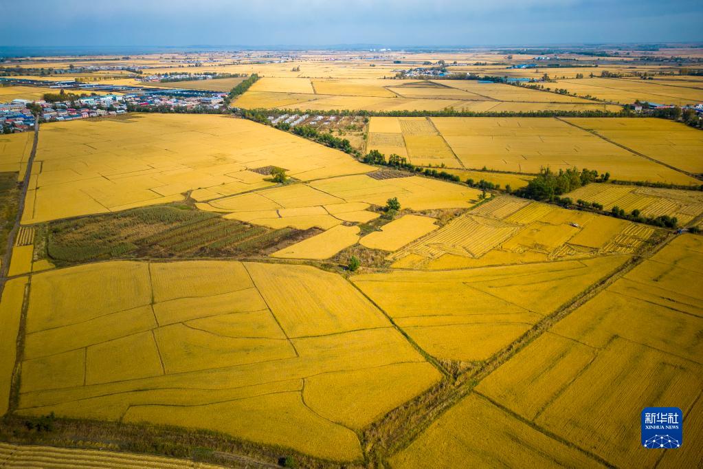 這是10月5日拍攝的哈爾濱市道外區民主鎮金黃色稻田(無(wú)人機照片)。