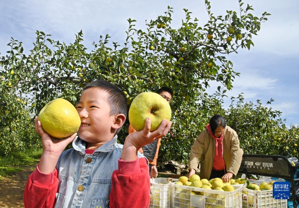10月4日,山東青島西海岸新區王臺街道石梁劉村一處梨園里,一名小朋友舉著(zhù)剛采摘的果實(shí)。