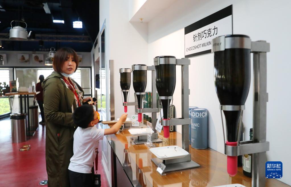位于上海楊浦濱江的奧地利珍得巧克力劇院品嘗區,游客體驗新奇的巧克力食品(2022年9月24日攝)。