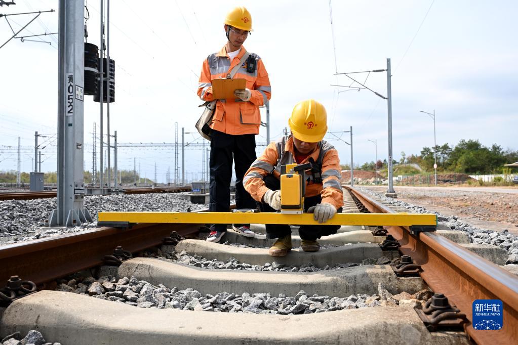 10月4日,在位于安徽黃山的杭昌高速鐵路黃山北存車(chē)場(chǎng),接觸網(wǎng)工在檢修接觸網(wǎng)設備。
