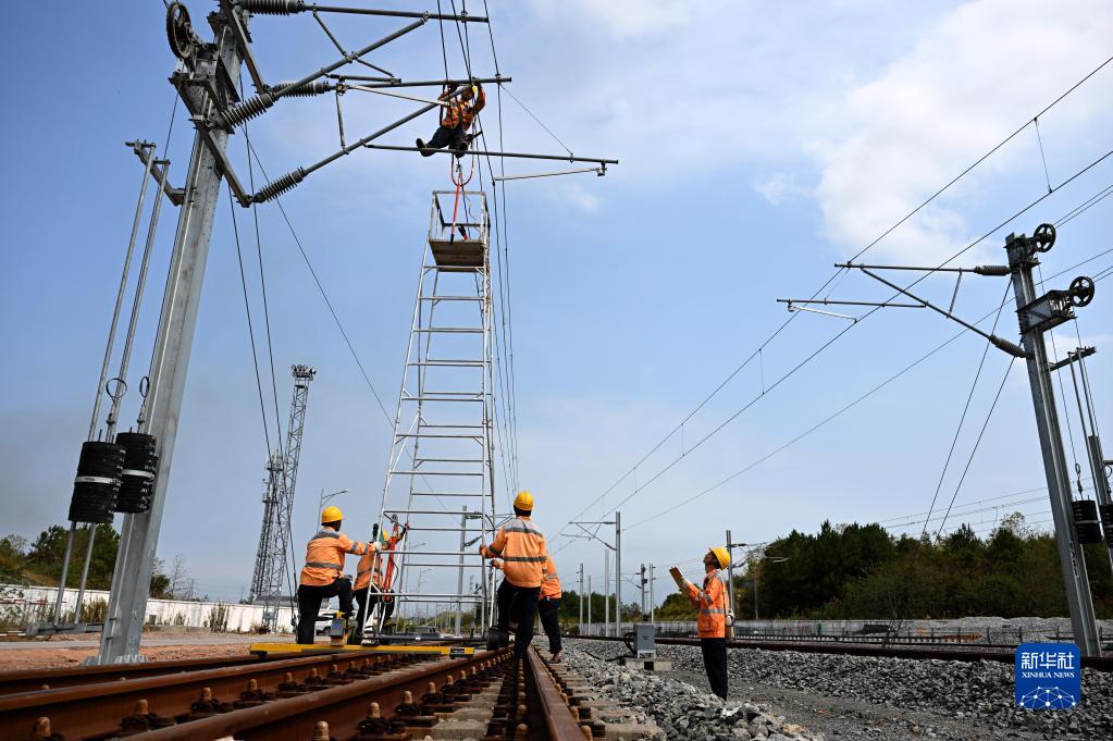 10月4日,在位于安徽黃山的杭昌高速鐵路黃山北存車(chē)場(chǎng),接觸網(wǎng)工在檢修接觸網(wǎng)設備。
