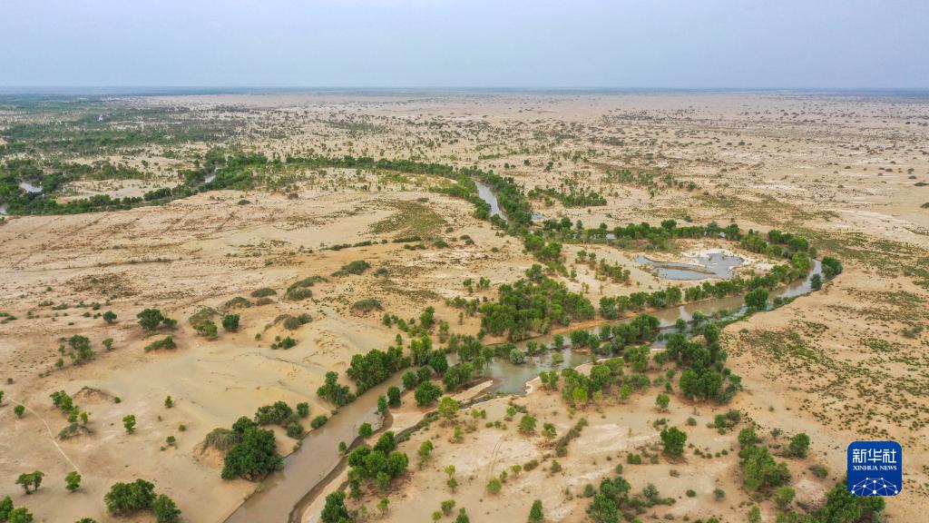 這是2022年6月20日拍攝的新疆尉犁縣墩闊坦鄉托布協(xié)區域,生態(tài)輸水滋養了植被(無(wú)人機照片)。