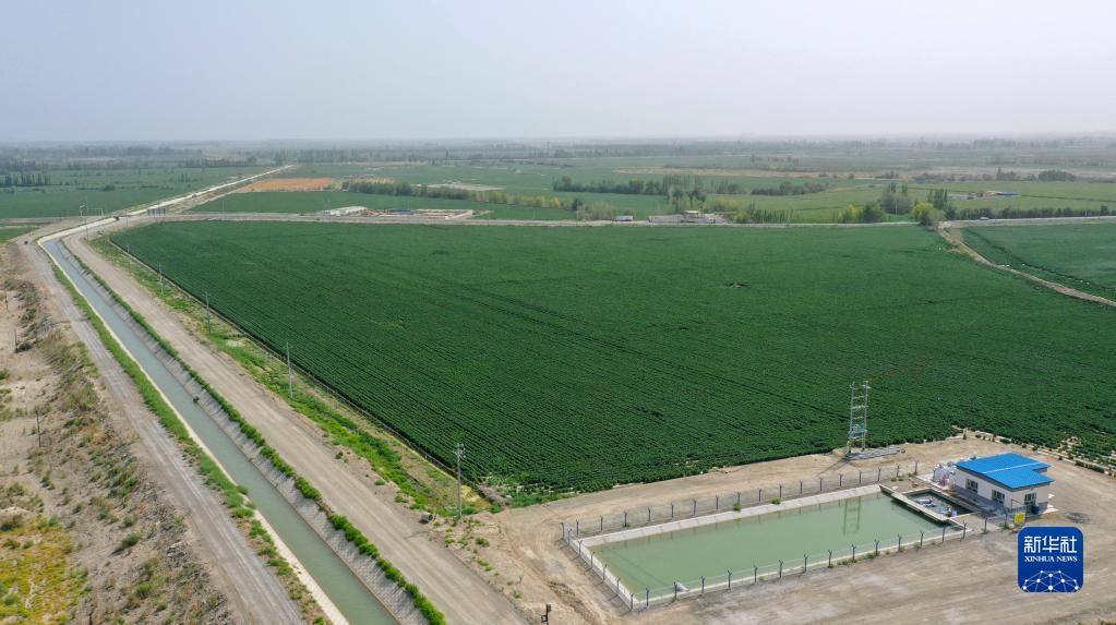 在新疆尉犁縣興平鎮達西村一處高標準農田,棉花進(jìn)入結鈴期,智能灌溉泵房正在運行,對棉田進(jìn)行無(wú)人化灌溉(2022年8月9日攝,無(wú)人機照片)。