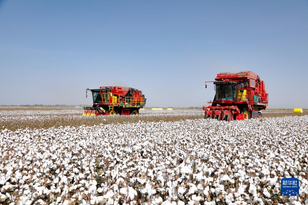 2022年9月30日,兩臺國產(chǎn)采棉機在新疆尉犁縣興平鎮統其克村的棉田里采收棉花。