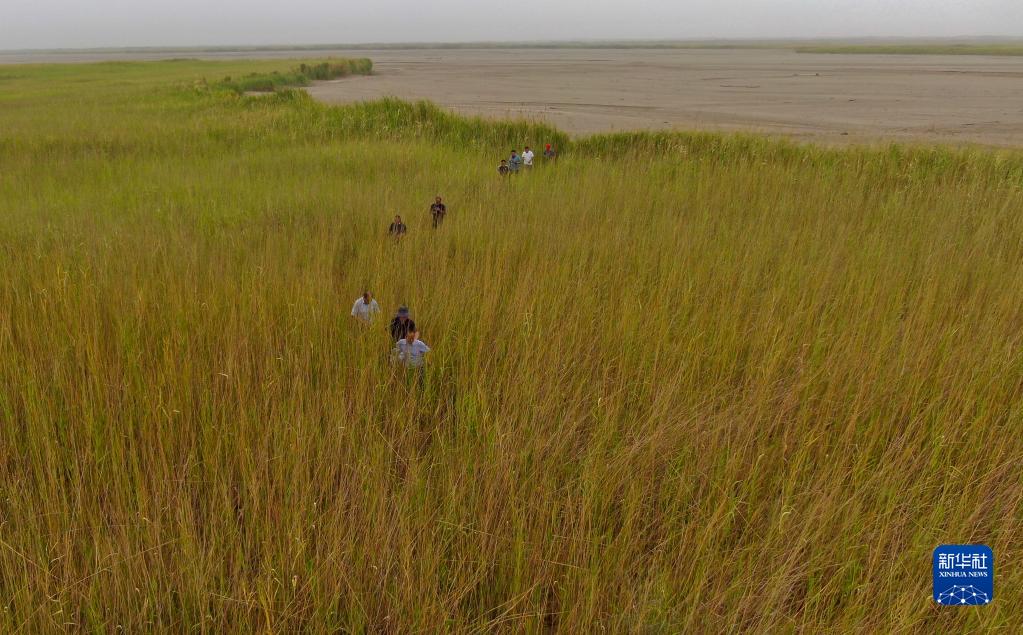 塔里木河流域管理局工作人員在臺特瑪湖湖區踏勘(2022年7月20日攝,無(wú)人機照片)。
