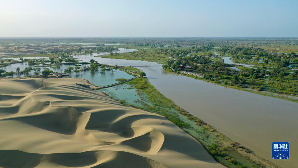 這是2022年8月20日在新疆尉犁縣羅布人村寨景區拍攝的塔里木河沿岸景色(無(wú)人機照片)。