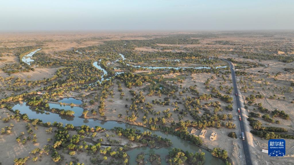這是2022年8月18日拍攝的塔里木河下游阿拉干斷面景象(無(wú)人機照片)。生態(tài)水滋潤兩岸胡楊等植被,同時(shí)保障交通要道少受風(fēng)沙侵襲。