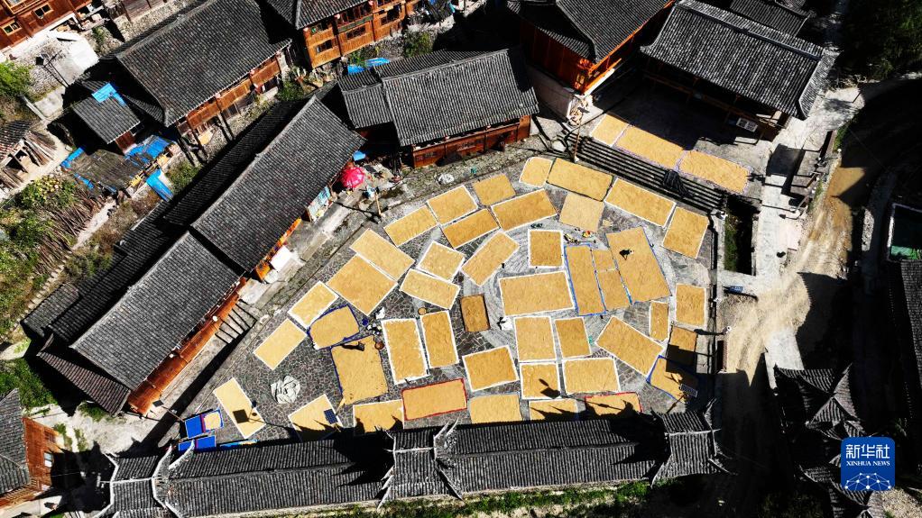 10月5日,貴州省黔東南苗族侗族自治州臺江縣紅陽(yáng)村村民在晾曬稻谷(無(wú)人機照片)。