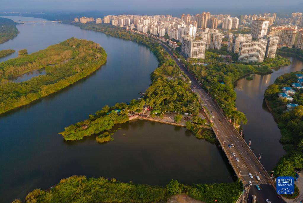車(chē)輛行駛在海南省瓊海市嘉積鎮萬(wàn)泉河畔新城區沿河路上(2022年3月25日攝,無(wú)人機照片)。